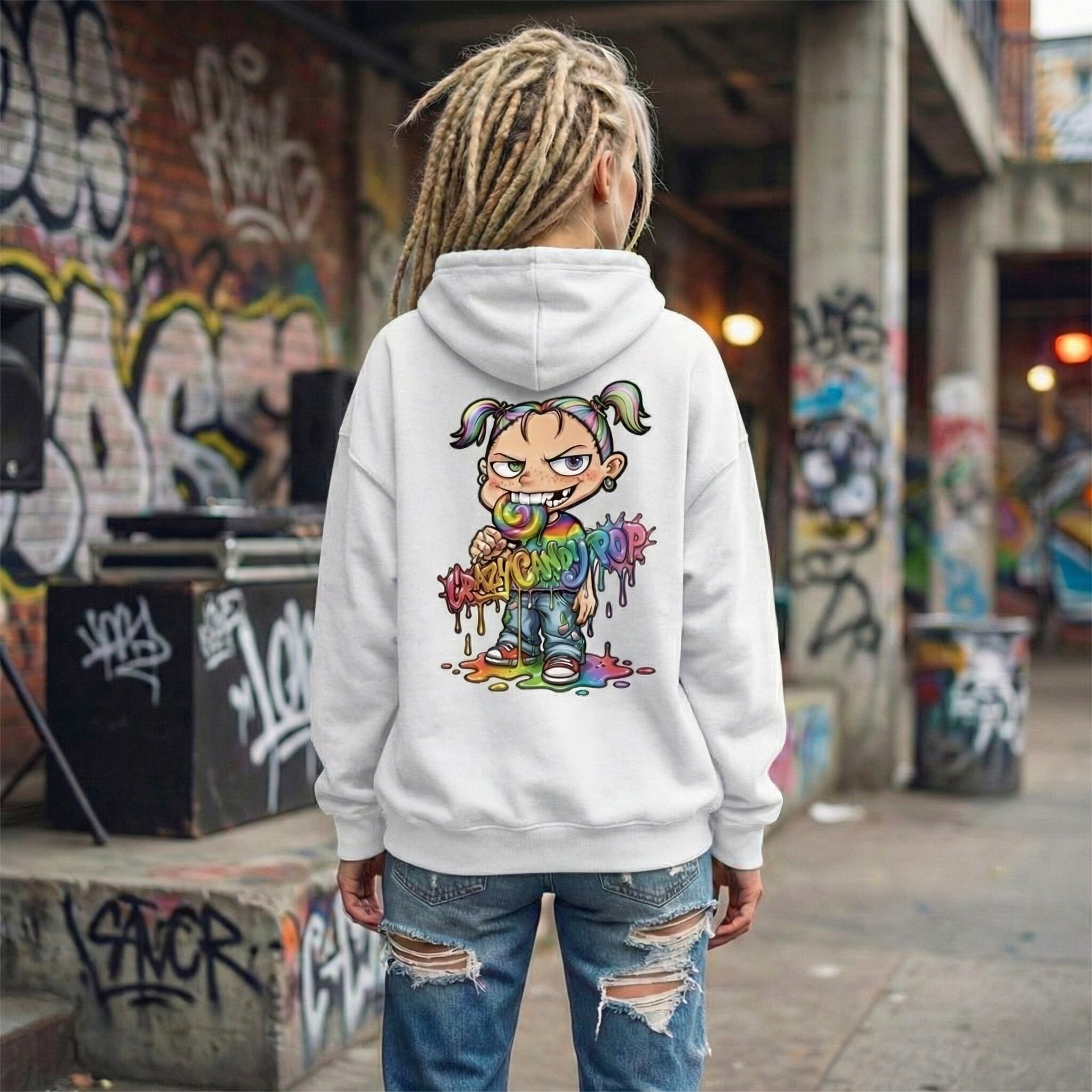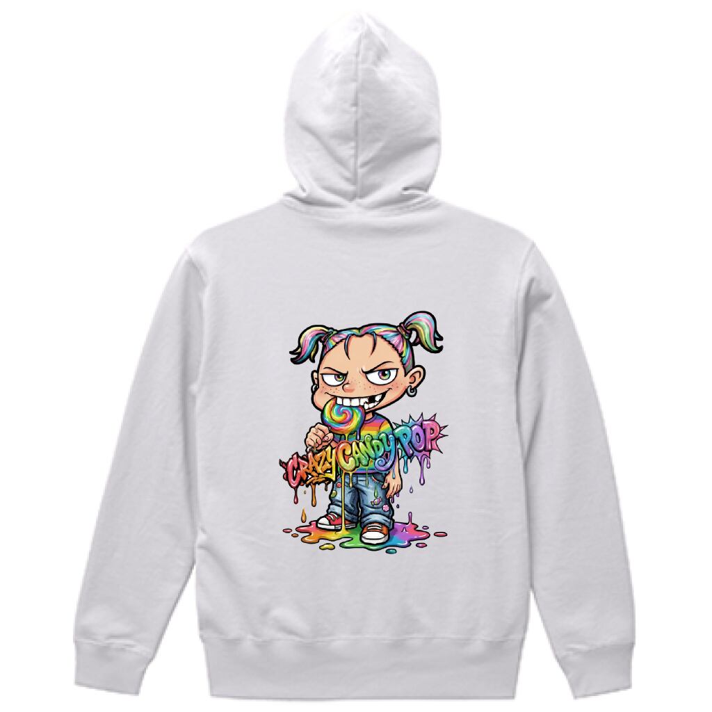 背中を飾るのは、キャンディを頬張るCRAZY CANDY POPのアイコン・キャラクター。