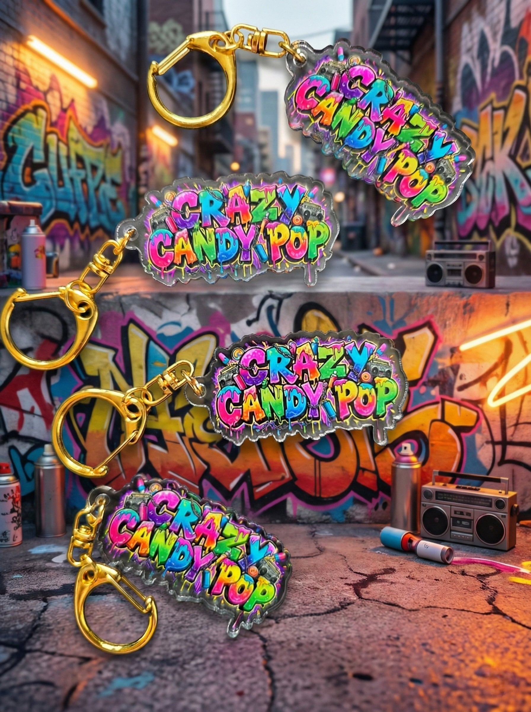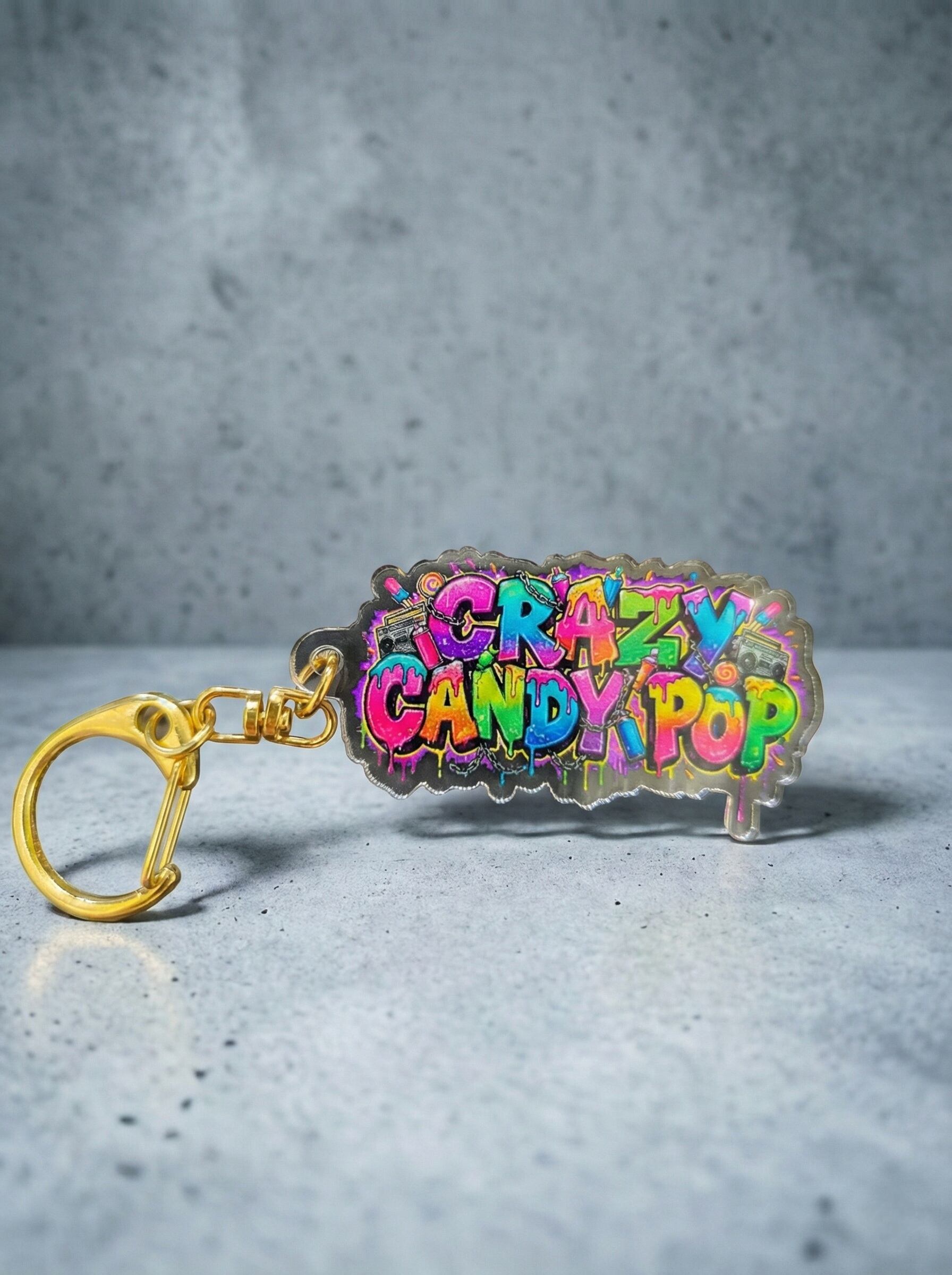 「CRAZY CANDY POP」のロゴを大胆にドロップさせた、インパクト大のアクリルキーホルダーです。